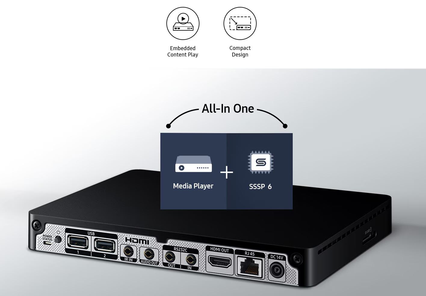 UHD Signage Player Box kombinuje nástroje pro zpracování informací a správu obsahu do jedné platformy, což zvyšuje jednoduchost ovládání. S hmotností pouhých 0,6 kg, i s integrovanými aplikacemi MagicINFO S Player 6 a SSSP 6, je díky kompaktnímu designu ideálním řešením.