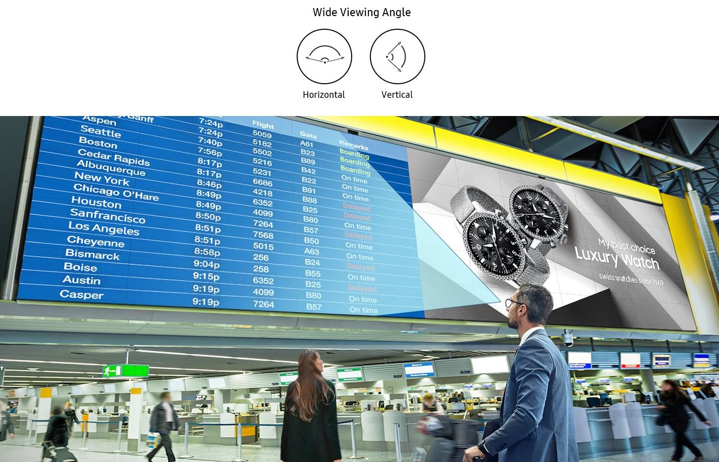 Díky širokým pozorovacím úhlům displeje je obsah snadno viditelný, i když diváci nestojí přímo před displejem. Diváci mohou získat jasné a přesné informace bez ohledu na uspořádání nebo umístění videostěny.
