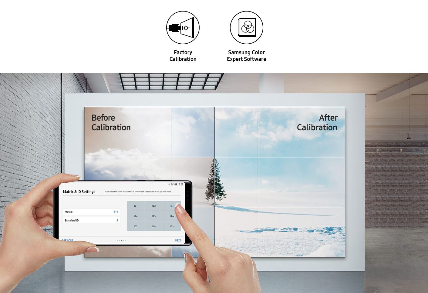 Víceúrovňové tovární nastavení zajišťuje jednotný jas a barvy. Uživatelé mohou také doladit pokročilá nastavení pomocí bezplatného výkonného softwaru Color Expert Pro. Pro rychlou a jednoduchou kalibraci umožňuje aplikace Color Expert Pro Mobile nastavení vyvážení bílé pro displeje až do velikosti 3x3 pomocí mobilního fotoaparátu.