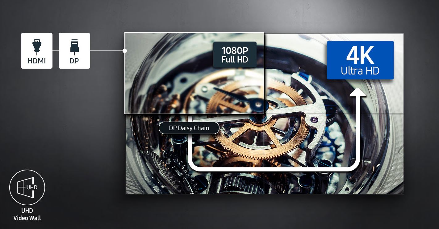 Videostěny Samsung poskytují působivý zážitek ze sledování v rozlišení UHD s minimálním úsilím. Díky designu řetězového zapojení využívajícímu porty DisplayPort 1.2 a HDMI může displej VMC-R promítat obsah v rozlišení UHD na více obrazovkách – až 5 x 5 – bez nutnosti externí grafické karty nebo rozbočovačů UHD.