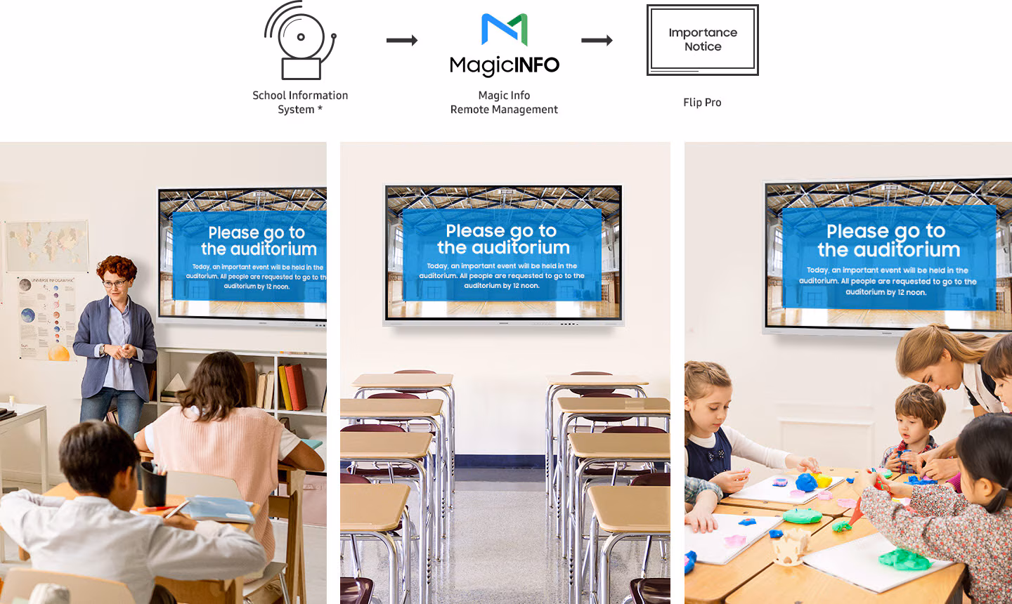 S vyuĹľitĂm sluĹľby Samsung MagicINFO Remote Management nabĂzĂ Flip Pro nová Ĺ™ešenĂ zobrazenĂ obsahu, upozornÄ›nĂ a varovánĂ ze školnĂho informaÄŤnĂho systĂ©mu pĹ™Ămo na obrazovku. VyuÄŤujĂcĂ a studenti v jednotlivĂ˝ch tĹ™Ădách s Flip tabulĂ obdržà dĹŻleĹľitĂ© informace pĹ™Ămo na jejĂ plochu.
