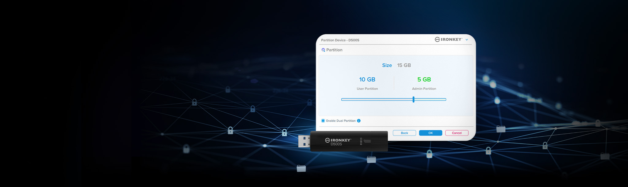 Disk D500S jako první na trhu obsahuje možnost Dual Hidden Partition, kdy může správce vytvořit dva zabezpečené oddíly vlastní velikosti pro správce a uživatele, což umožňuje vytvoření skrytého úložiště souborů, které lze podle potřeby použít k poskytování souborů pro User partition. Při používání nedůvěryhodných systémů nebo sdílení disku udržují skrytá úložiště souborů data v bezpečí a neviditelná, pokud k nim není přistupováno řádným způsobem.