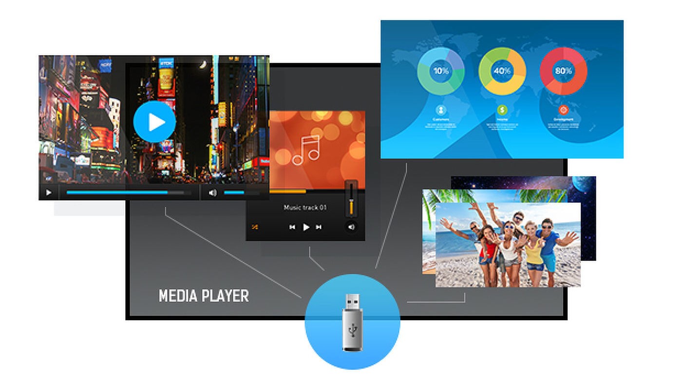 Tento VA panel s vysokým jasem 500 cd/m2 a rozlišením 4K UHD (3840 × 2160) poskytuje výjimečný barevný a obrazový výkon. Díky vestavěnému přehrávači médií můžete přehrávat oblíbenou hudbu a zobrazovat nejkrásnější videa, fotografie a obrázky přímo na obrazovce.