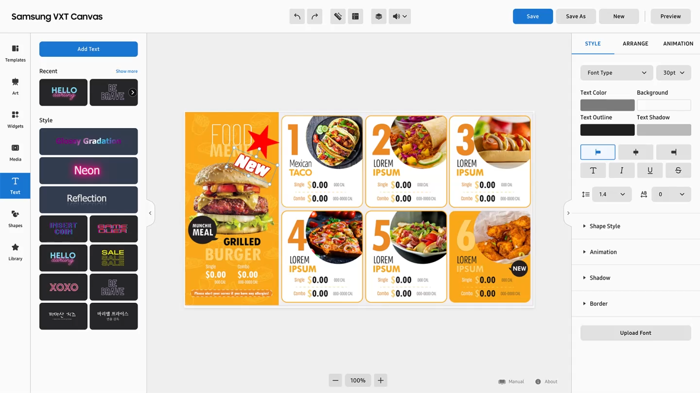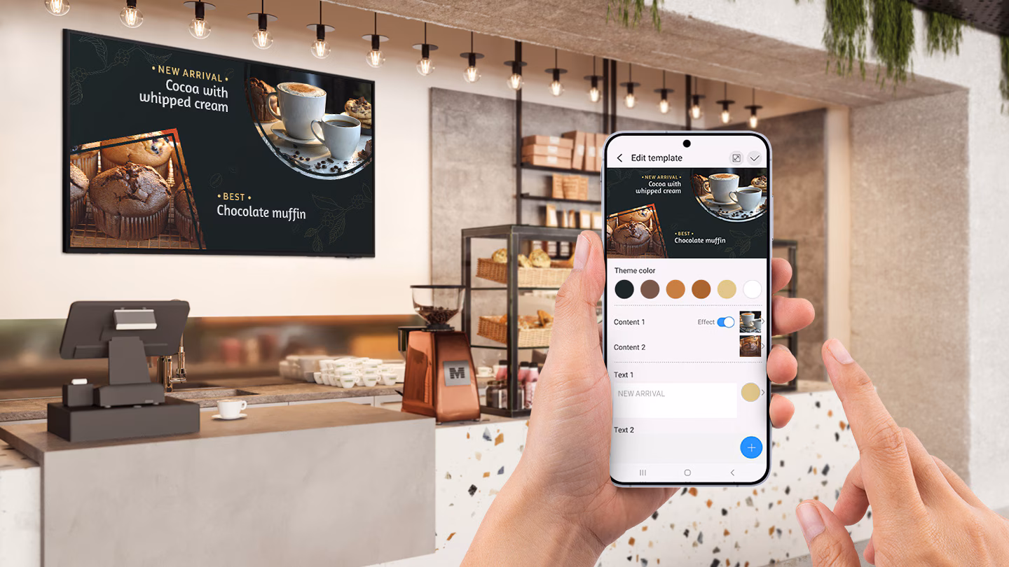 Aplikace Samsung Business TV, dostupná pro zařízení Android a iOS, umožňuje pohodlně ovládat, plánovat a individuálně zobrazovat obsah na dálku. Kromě toho mohou uživatelé pomocí různých předem připravených šablon snadno vytvářet atraktivní obsah.