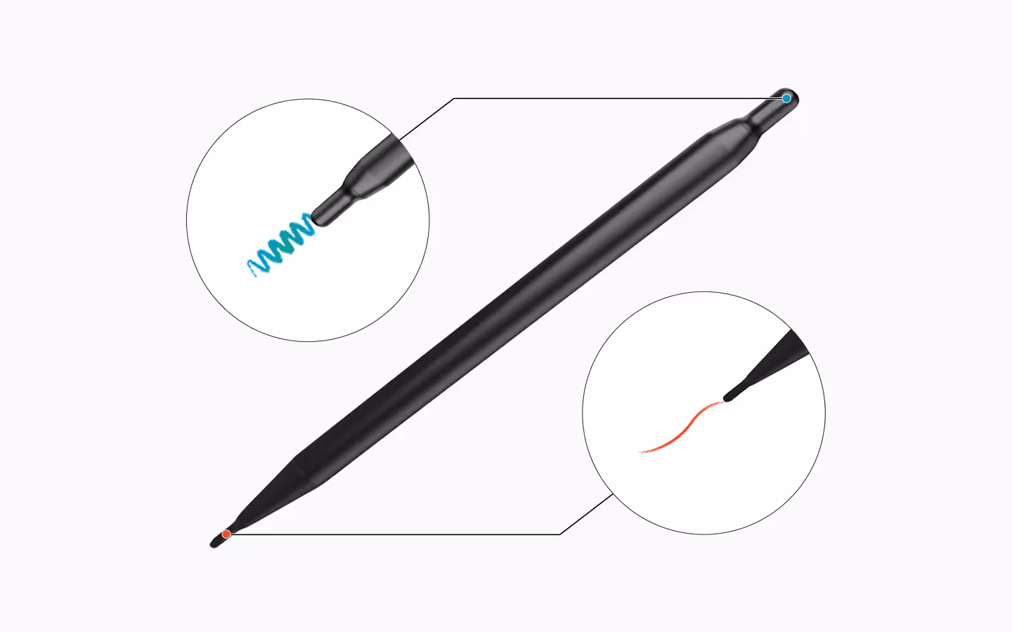 Funkce duálního pera umožňuje použití dvou různých psacích nástrojů bez prostojů. S nasazeným oboustranným hrotem mohou uživatelé bez námahy přepínat mezi dvěma různými barvami na přední a zadní straně pasivního pera – aniž by museli měnit nastavení nebo přerušovat průběh lekce.