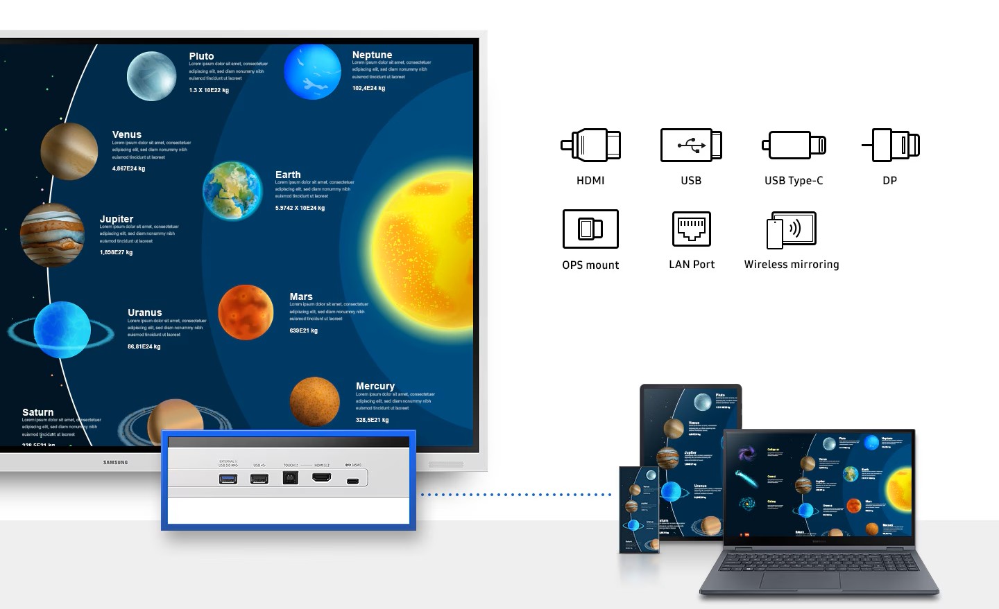 Flip Pro poskytuje nÄ›kolik moĹľnostĂ pĹ™ipojenĂ, vÄŤetnÄ› USB, HDMI, DP nebo OPS slotĹŻ. VyuÄŤujĂcĂ mohou snadno pĹ™idat jakĂ©koliv zaĹ™ĂzenĂ pro pĹ™Ăstup k obsahu a zobrazenĂ informacĂ na vÄ›tšà ploše, stejnÄ›, jako se pĹ™ipojit k jakĂ©koliv sĂti a dalšĂm zaĹ™ĂzenĂm prostĹ™ednictvĂm LAN a bezdrátovĂ©ho zrcadlenĂ obrazovky.