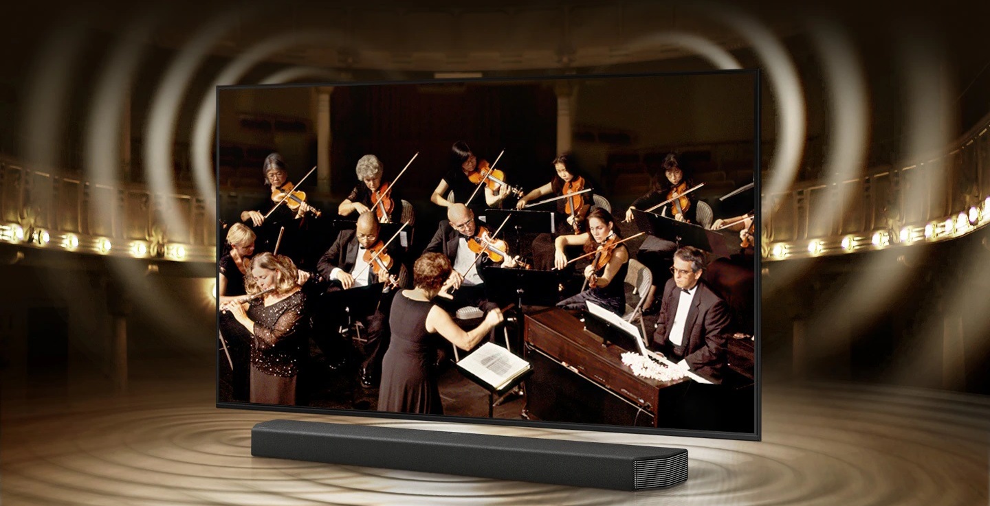 Q-Symphony umožňuje, aby reproduktory televizoru a soundbaru hrály současně v harmonii. Vzniká tak přesvědčivý prostorový efekt, který lze vytvořit díky harmonické souhře mezi televizorem a soundbarem.