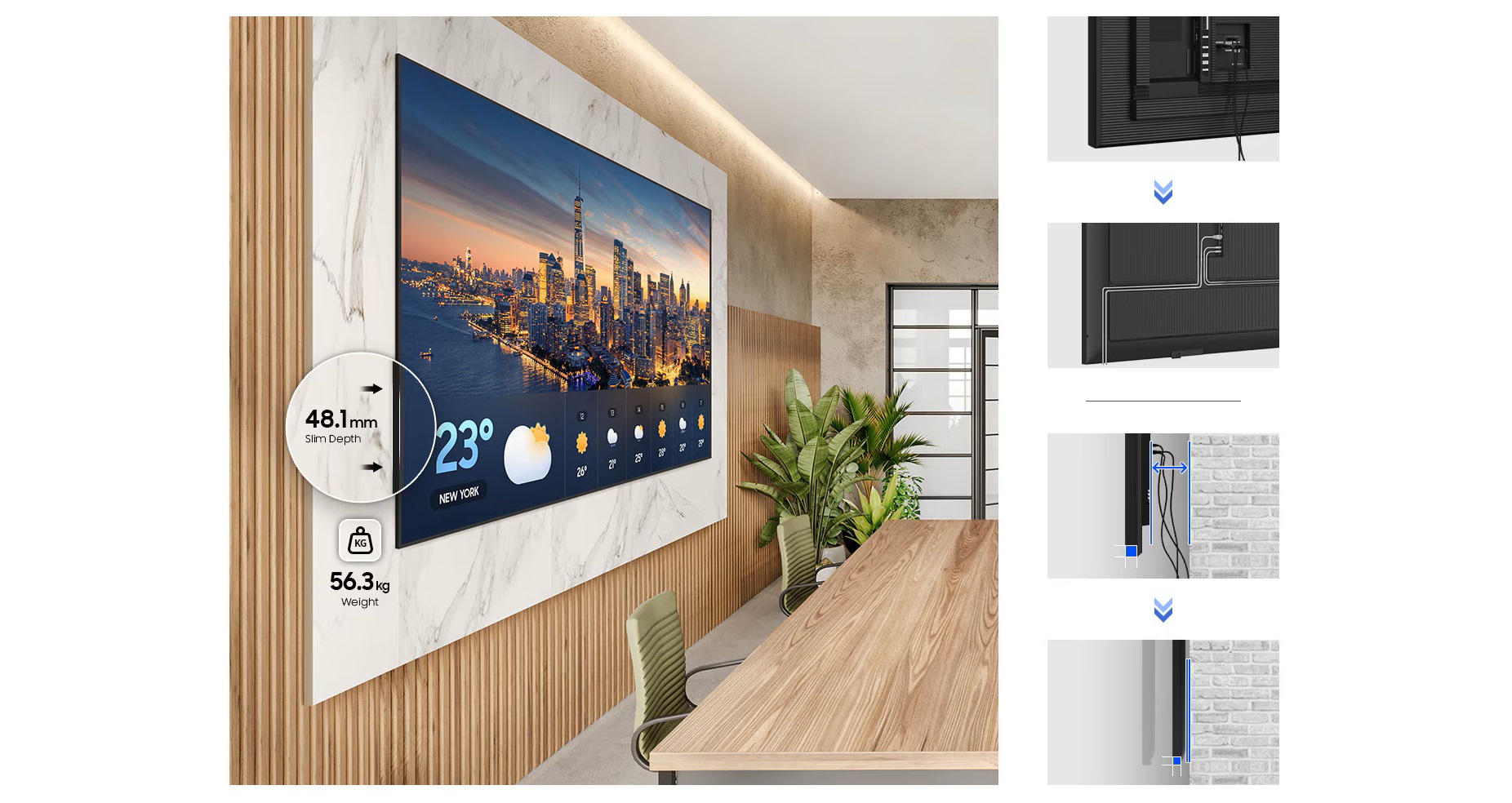 Nepřekonatelná ultratenká hloubka 28,5 mm z něj dělá QHC nejtenčí variantu v UHD sérii Samsung. Je kompatibilní s nástěnným držákem Slim Fit (volitelné-není součástí balení), který vám umožňuje úhledně a snadno jej nainstalovat na jakékoli místo. QHC optimalizuje prostor svým elegantním designem, který hladce zapadne do vašeho obchodního prostředí.