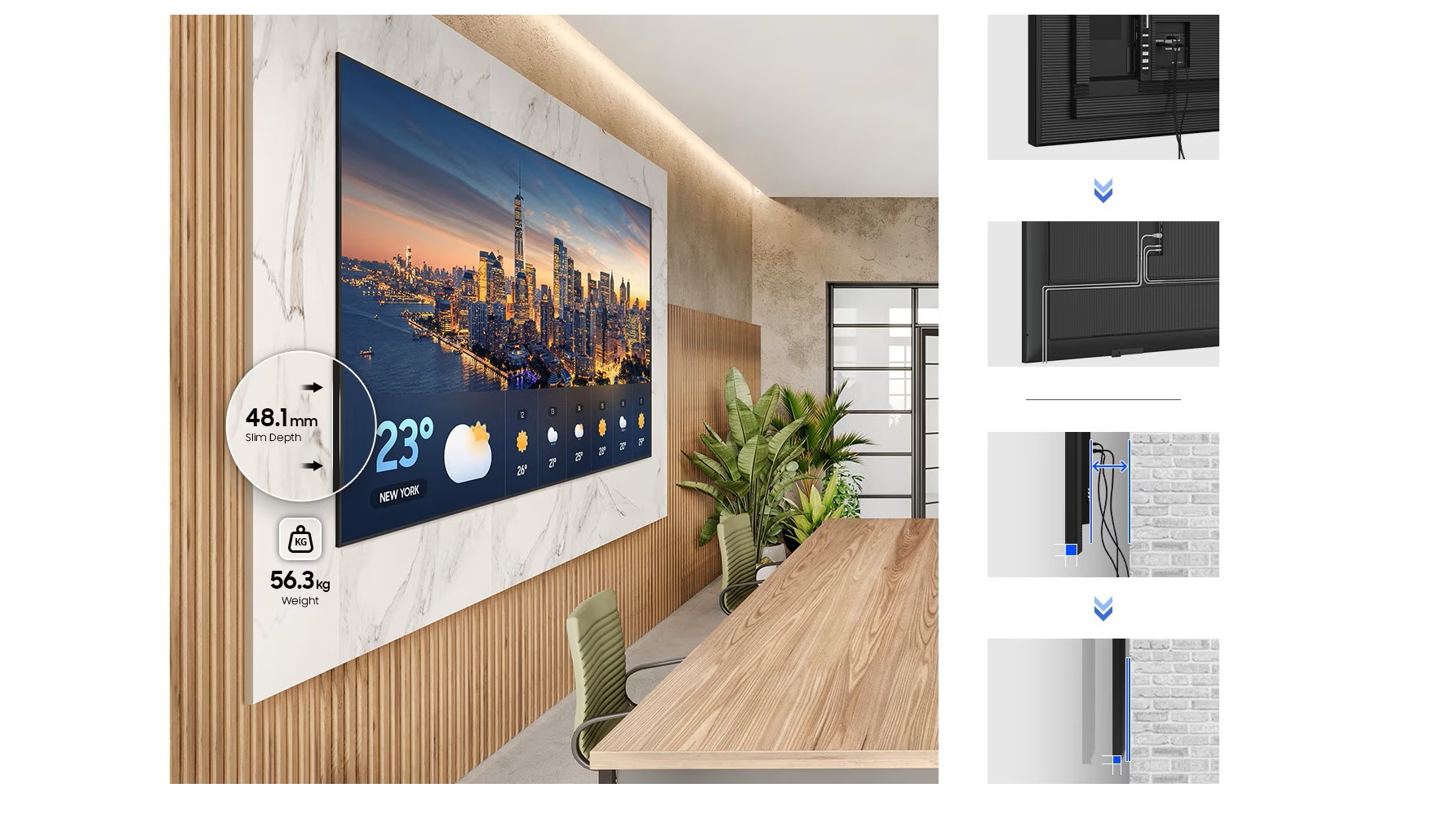 Znovu vymezte a optimalizujte svĹŻj prostor dĂky elegantnĂmu a štĂhlĂ©mu designu. S hloubkou pouhĂ˝ch 48,1mm a hmotnostĂ 56,3kg se jedná o nejtenÄŤĂ 98palcovĂ˝ displej ve svĂ© tĹ™ĂdÄ›. Porty směřujĂcĂ ven umoĹľĹujĂ montáž pod omĂtku a maximalizujĂ tak Ăşsporu mĂsta. DĂky minimalistickĂ©mu designu dodá QH98C vašemu displeji sofistikovanost.