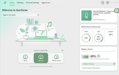 Na domovské stránce AcerSense™ můžete sledovat využità systému a vybrat si mezi režimy Výkon, Normálnà a Tichý.