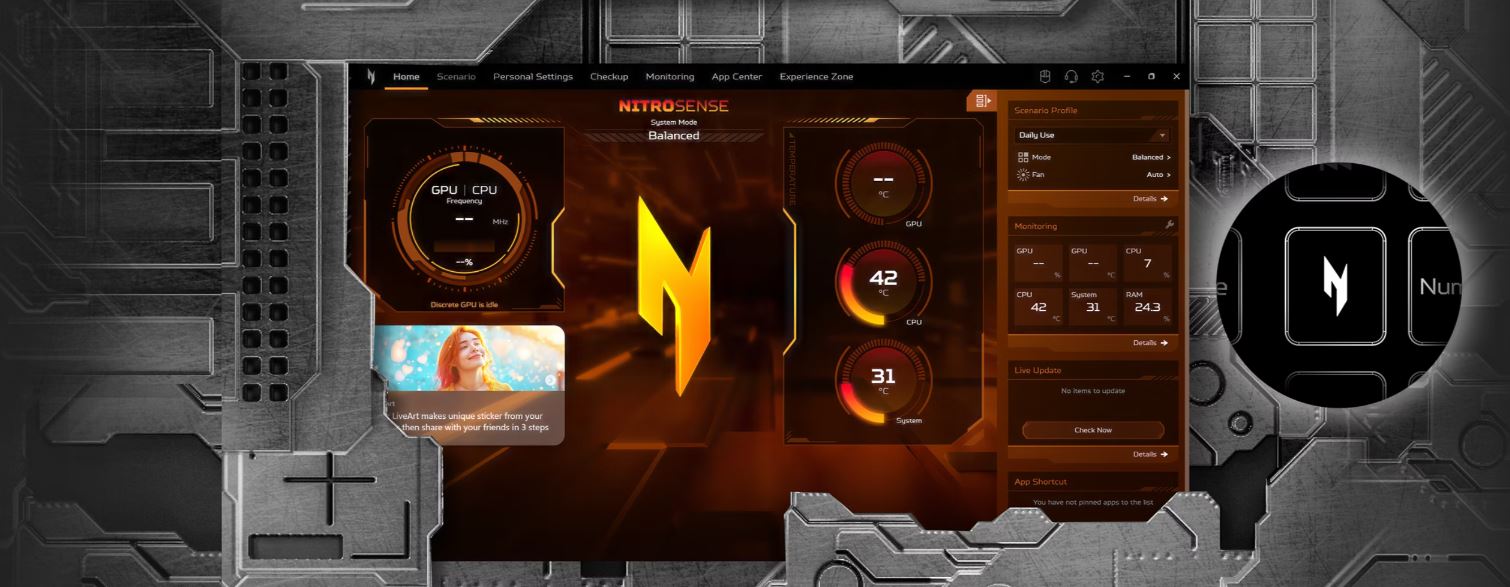 PĹ™Ăstup k NitroSense a Acer My Key pro okamĹľitĂ© ladÄ›nĂ a zkratky pomocĂ urÄŤenĂ˝ch kláves. Spravujte chlazenĂ, osvÄ›tlenĂ a oblĂbenĂ© aplikace bez rušenĂ soustĹ™edÄ›nĂ.