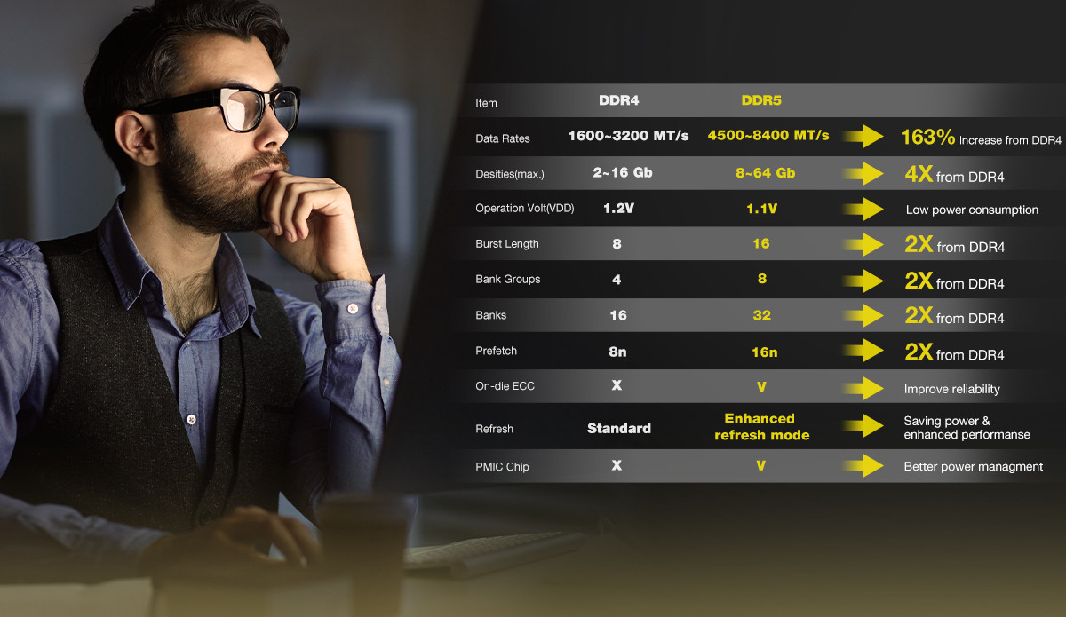 Moduly DDR5 poskytují dvojnásobek kapacity než moduly DDR4, protože umožňují více skupin zásobníků paměti a více samotných zásobníků. Kromě toho mají dvojnásobnou délku shluku a předběžné načtení, což zvyšuje počet zápisů dat a množství dat přijatých předem. A aby byla zajištěna integrita dat, jsou vybaveny technologií ECC (Error Correcting Code).
