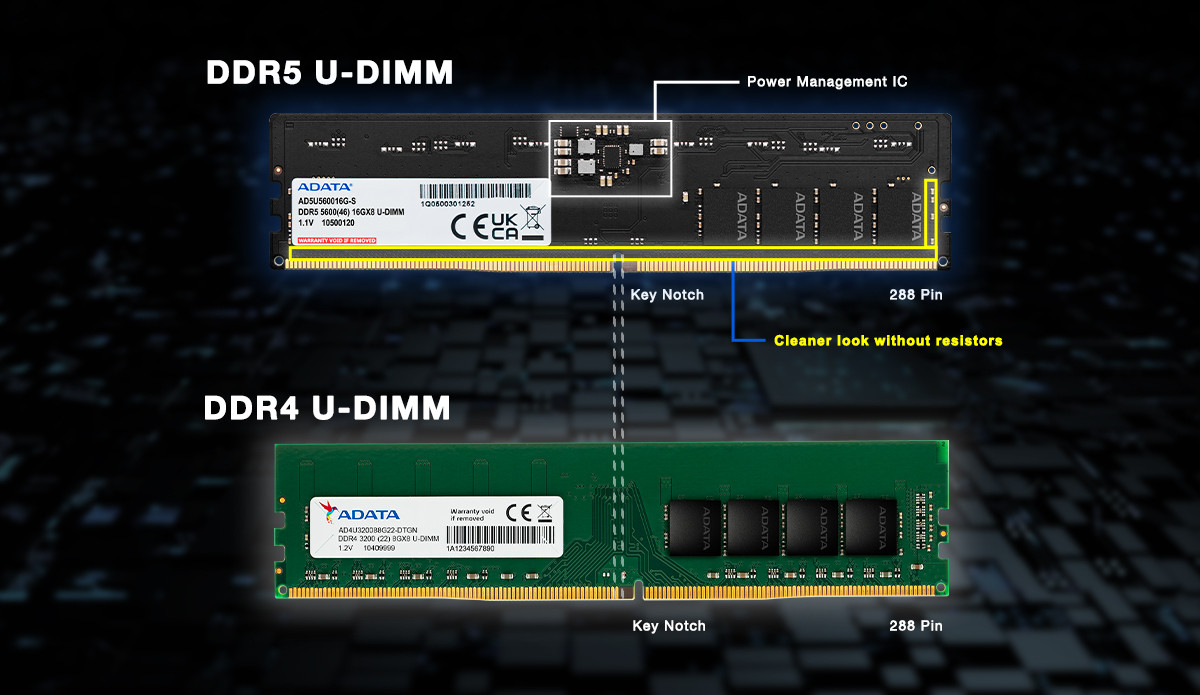 Moduly DDR5 U-DIMM mají stejné rozměry a počet vývodů jako moduly DDR4. Nejviditelnějším rozdílem je poloha drážky, která zabraňuje nesprávné instalaci. V modulu DDR5 jsou také zabudovány I/O odpory s rezistory CMD/ADD. Moduly DDR5 mají rovněž prostší vzhled než DDR4. Kromě toho je uprostřed vidět PMIC.