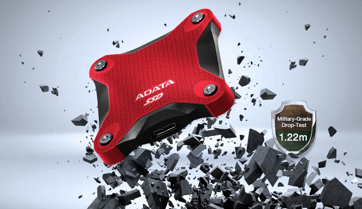 Disk SD620 je pokryt ochranným silikonovým pláštěm proti nárazům, který ve srovnání se standardními externími disky SSD představuje vynikající pružný nárazník. Prošel přísným testováním MIL-STD-810G 516.6 na pád a zůstane nepoškozený i při pádu z výšky 1,22 metru. Díky odolnosti SD620 je jeho přenášení naprosto bezproblémové!