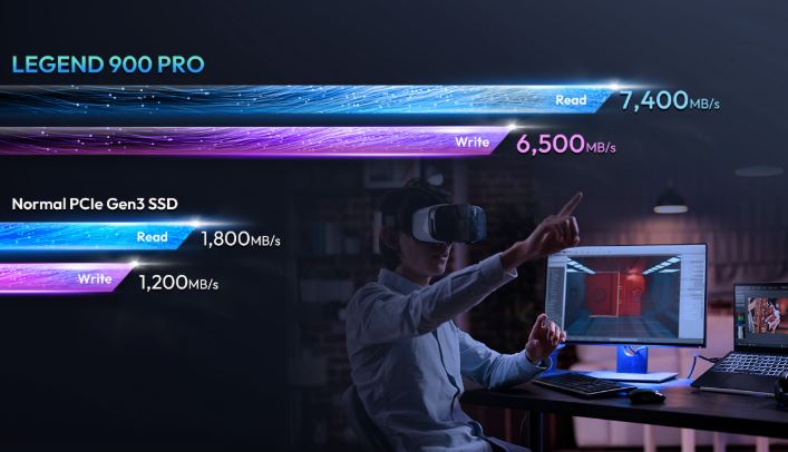 LEGEND 900 PRO se může pochlubit sekvenční rychlostí čtení/zápisu až 7 400/6 500 MB za sekundu, což je 4krát rychlejší než standardní PCIe Gen3 SSD a 13krát rychlejší než SATA. Tato jednotka SSD je plně zpětně kompatibilní se současnými platformami PCIe 3.0. Poskytuje vynikající výstup pro produkci na vysoké úrovni, jako je návrh virtuální vizualizace, filmová animace a vývoj her!