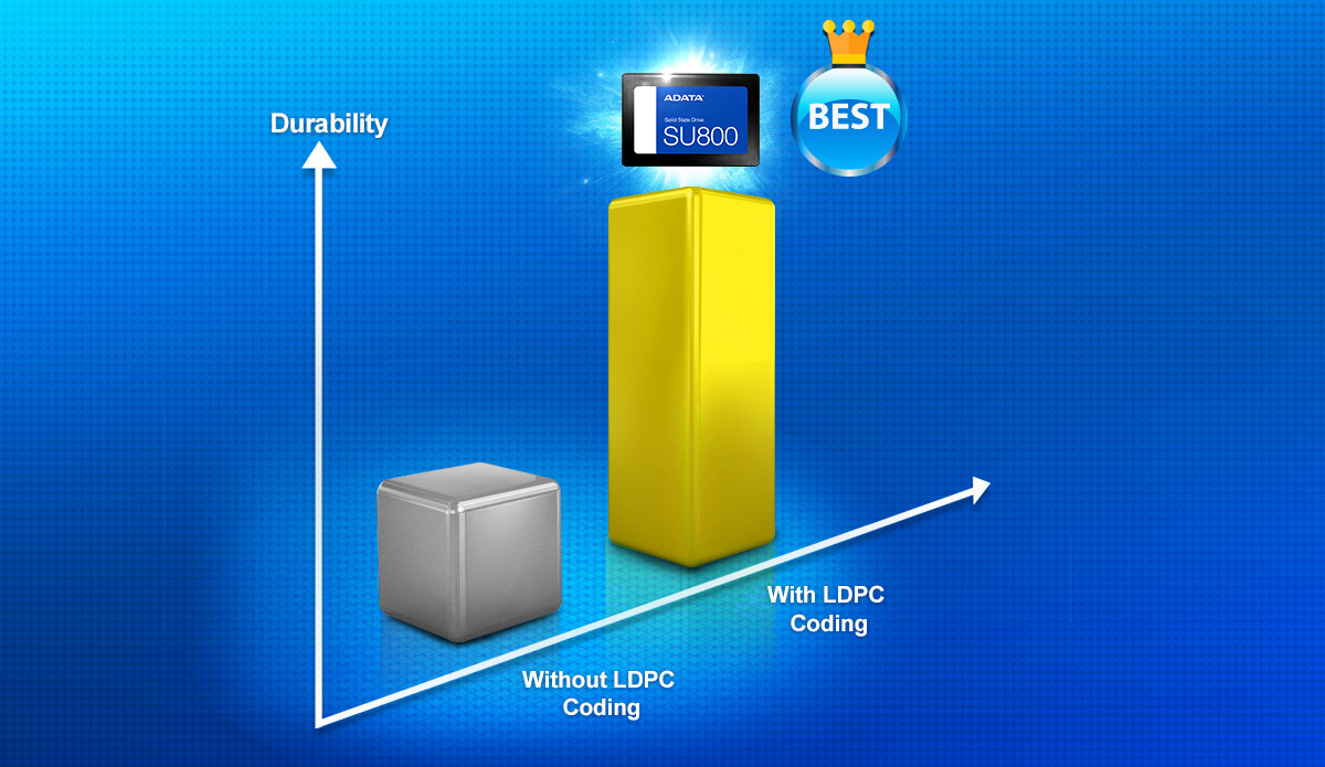 U disku Ultimate SU800 byl implementován kód pro korekci chyb parity s nízkou hustotou, což vedlo k velkému snížení počtu chyb dat a zlepšení integrity dat. Proto disk chrání váš cenný obsah před poškozením v mnohem větším rozsahu, než u disků SSD bez ECC nebo disků SSD, které používají jenom základní korekci chyb BCH.