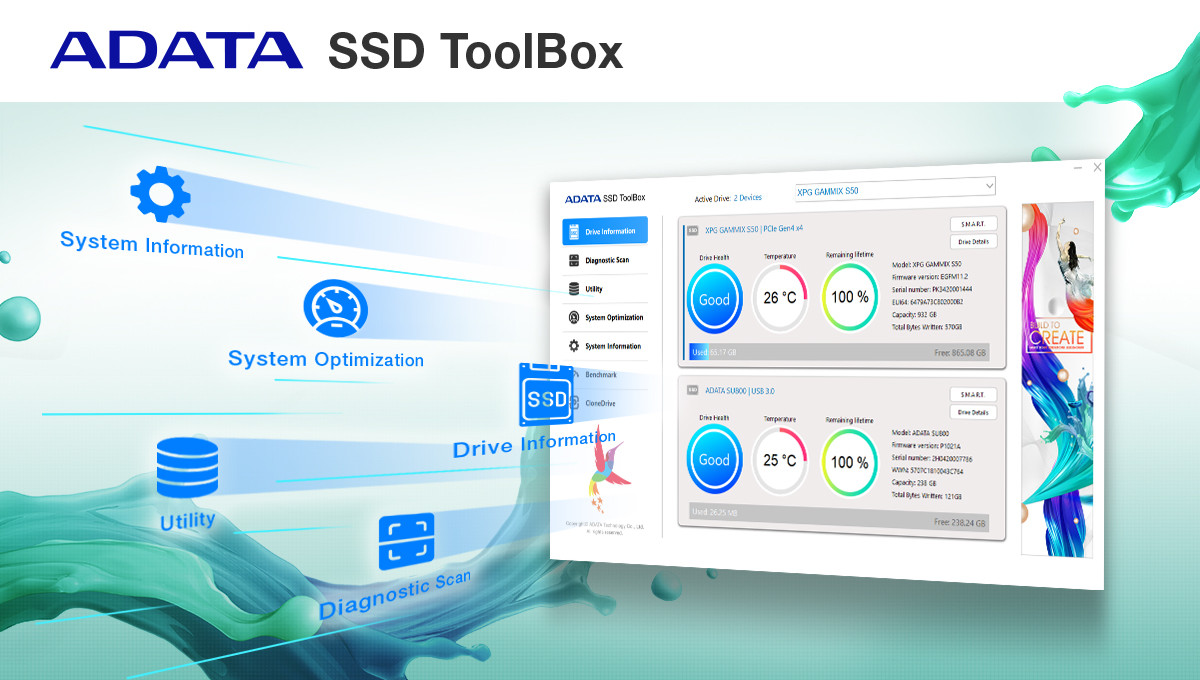 Při každém nákupu disku Ultimate SU800 si můžete bezplatně stáhnout softwarový nástroj ADATA SSD Toolbox a Migration Utility. Nástroj SSD Toolbox umožňuje monitorovat a spravovat disk Ultimate SU800, včetně jeho stavu, úrovně opotřebování a celkové životnosti. Nástroj pro migraci dat jsou obzvláště vhodné pro uživatele, kteří přecházejí z pevných disků na disky SSD, protože je navržen pro jednoduché a rychlé zálohování a migraci obsahu celých disků, včetně operačního systému.