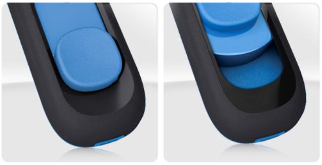 Konektor USB je ukryt v kompaktním těle a je plně chráněn bez potřeby krytu jednotky. Jednoduchým přejetím palcem dopředu je připraven k použití a zpětný pohyb složí konektor pro uložení nebo cestování.