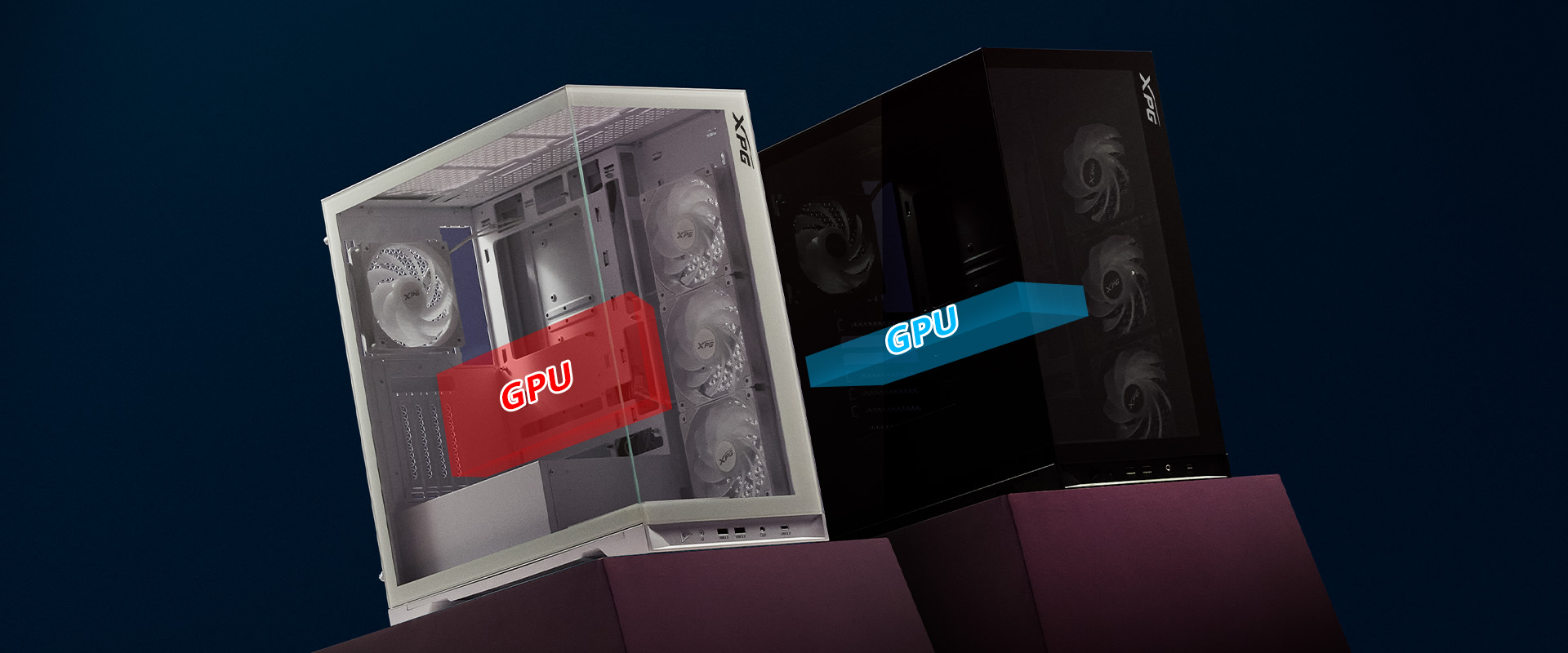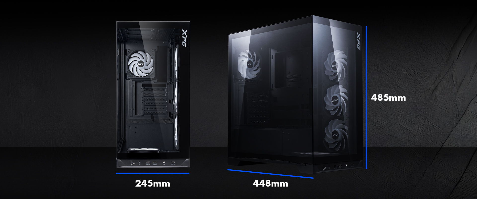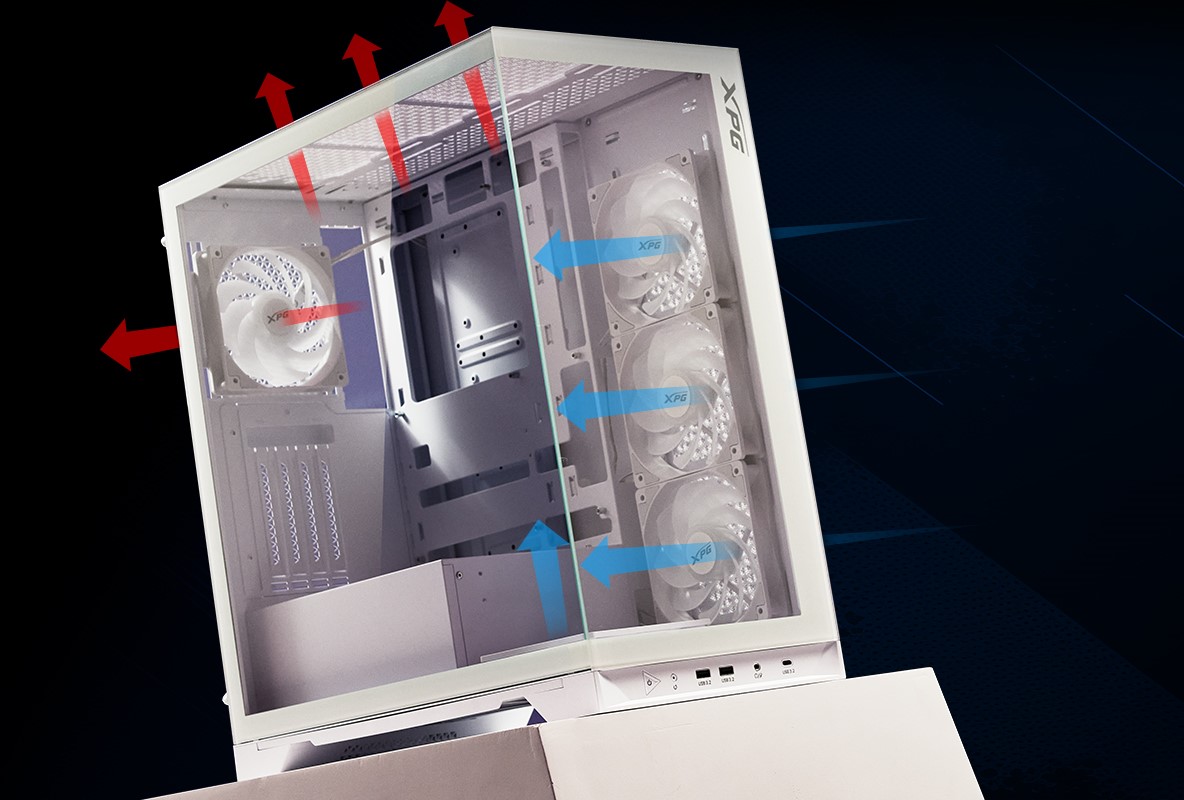 Nejnovější šasi XPG s výhledem na oceán se může pochlubit kompatibilitou s nejnovějšími základními deskami ATX s reverzním konektorem a představuje tak dokonalou platformu pro prezentaci čistého vedení kabelů. Je vybavena čtyřmi předinstalovanými reverzními ventilátory a jedním standardním ventilátorem, což zajišťuje optimální výkon proudění vzduchu při zachování elegantního estetického vzhledu z každého úhlu.
