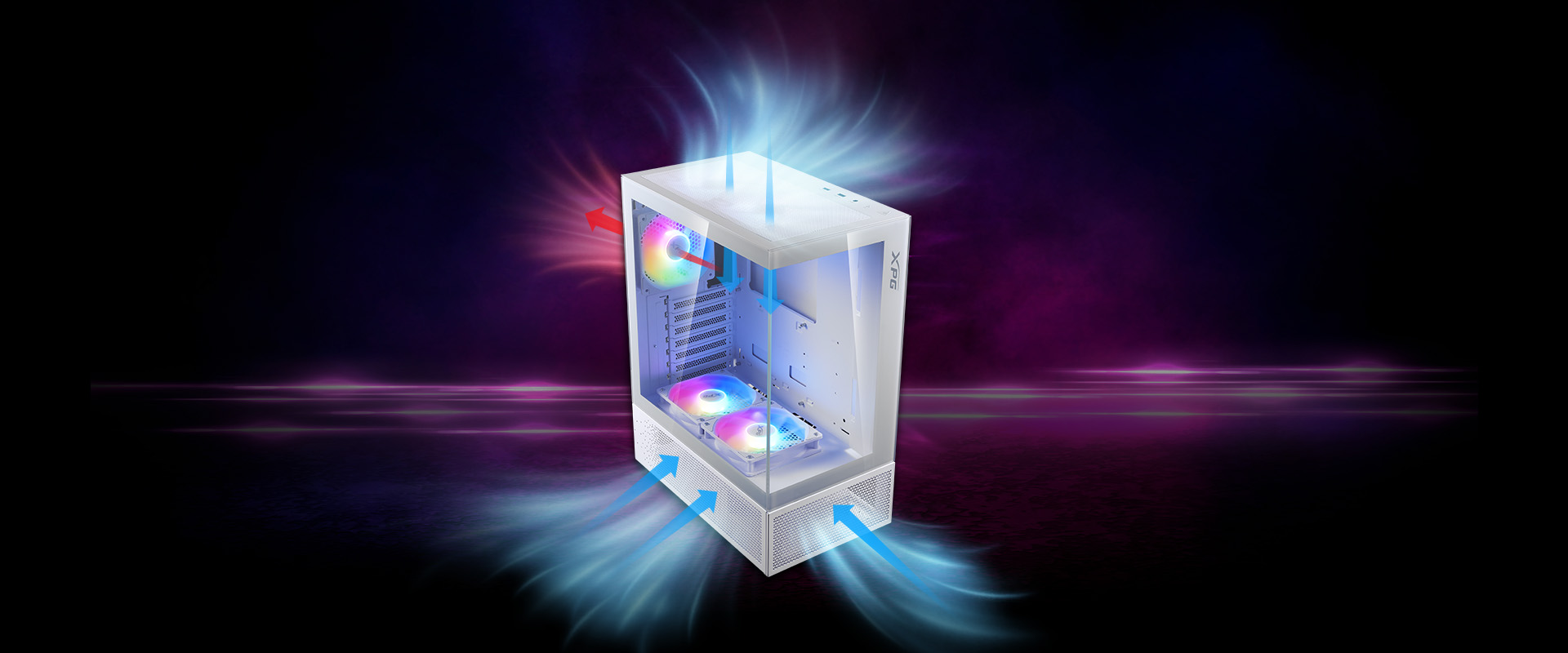 XPG INVADER X MINI vyniká svĂ˝m peÄŤlivÄ› navrĹľenĂ˝m systĂ©mem proudÄ›nĂ vzduchu a nabĂzĂ vynikajĂcĂ chladicĂ vĂ˝kon. Je dodáván s 5 ventilátory ARGB, vÄŤetnÄ› 4 obrácenĂ˝ch ventilátorĹŻ nahoĹ™e a krytu napájenĂ, coĹľ zajišťuje účinnĂ˝ a efektivnĂ proudÄ›nĂ vzduchu v celĂ©m pouzdru.