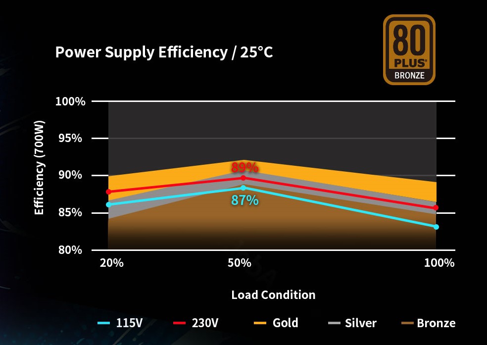 XPG PROBE pĹ™ekraÄŤuje poĹľadavky na certifikaci 80 Plus Bronze, kdyĹľ nabĂzĂ aĹľ 87% účinnost pĹ™i 50% zatĂĹľenĂ. Zajišťuje stabilnĂ dodávku napájenĂ všem komponentám a minimalizuje riziko poškozenĂ v souvislosti s napájenĂm.