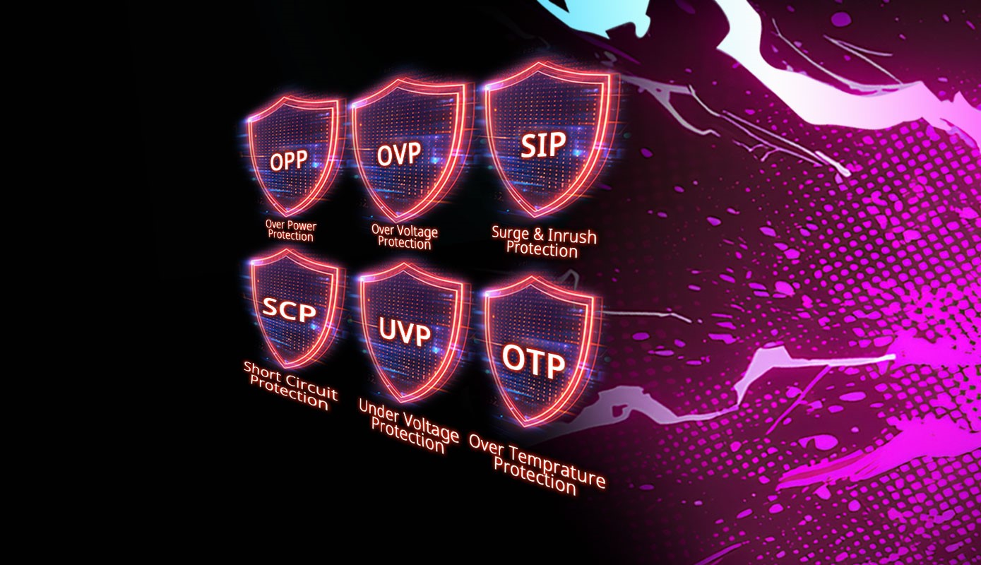 NapájecĂ zdroj XPG PROBE nabĂzĂ 6 robustnĂch ochran, kdyĹľ systĂ©m chránĂ pĹ™ed nadmÄ›rnĂ˝m vĂ˝konem, nadmÄ›rnĂ˝m napÄ›tĂm, pĹ™epÄ›tĂm a nárazovĂ˝m proudem, podpÄ›tĂm, zkraty a pĹ™ed pĹ™ehřátĂm.