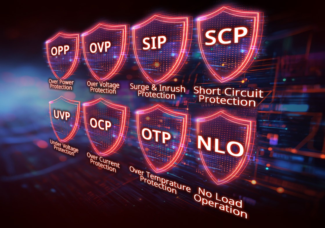 * Ochrany: OCP / OVP / UVP / OPP / SCP / OTP / NLO / SIP
