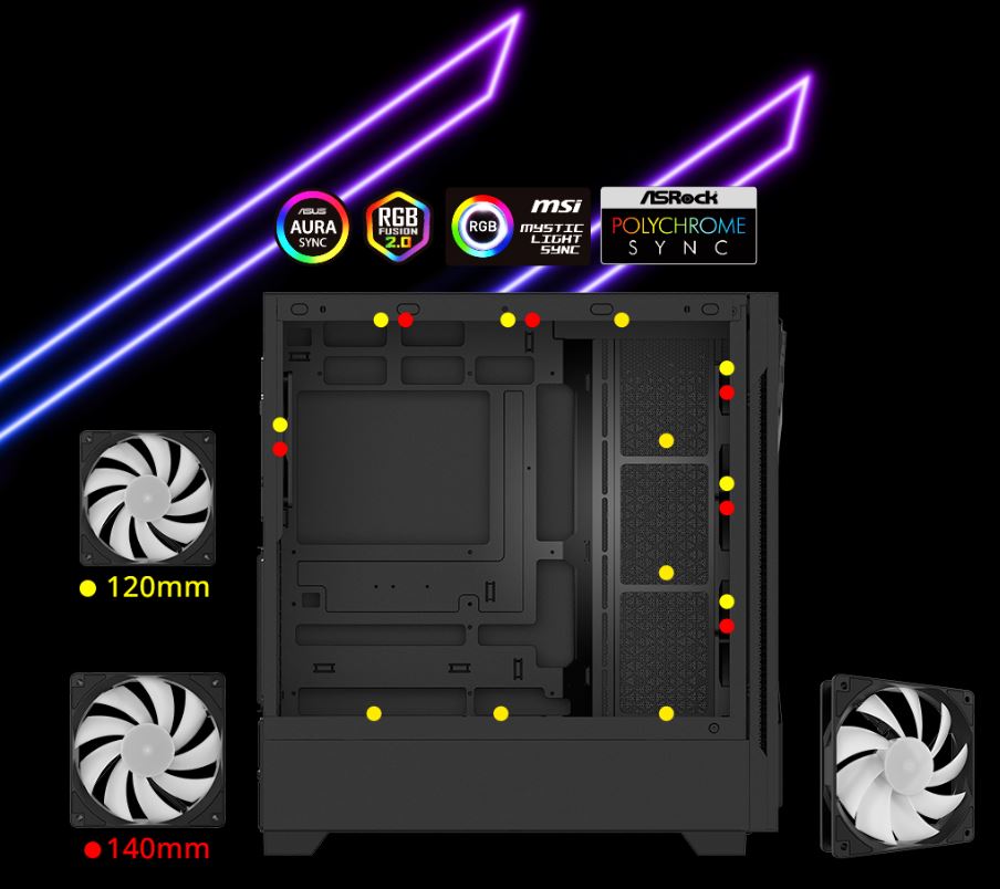 Včetně 4 předinstalovaných 120mm zřetězených ARGB ventilátorů podporuje skříň STARKER AIR BTF až dvanáct 120mm ventilátorů nebo kombinaci šesti 140mm a tří 120mm ventilátorů, takže dokáže poskytnout vynikající proudění vzduchu i pro ty nejnáročnější sestavy. Předinstalované ARGB ventilátory lze snadno ovládat přes kompatibilní software základní desky, takže lze efekt osvětlení synchronizovat s ostatními ARGB komponentami a dosáhnout úžasného, jednotného výsledku.