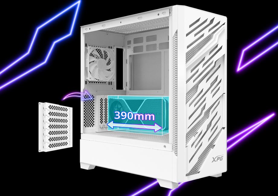 Vzhledem k tomu, jak rostou rozměry grafických karet nových generací, stává se nutností i větší prostor pro jejich umístění. A právě proto nabízí skříň STARKER AIR BTF prostor pro GPU o délce až 390 mm. Držák GPU lze navíc sundat a otočit o 90 stupňů, aby bylo možné nainstalovat grafickou kartu svisle, což nejen dobře vypadá, ale také může zlepšit proudění vzduchu.