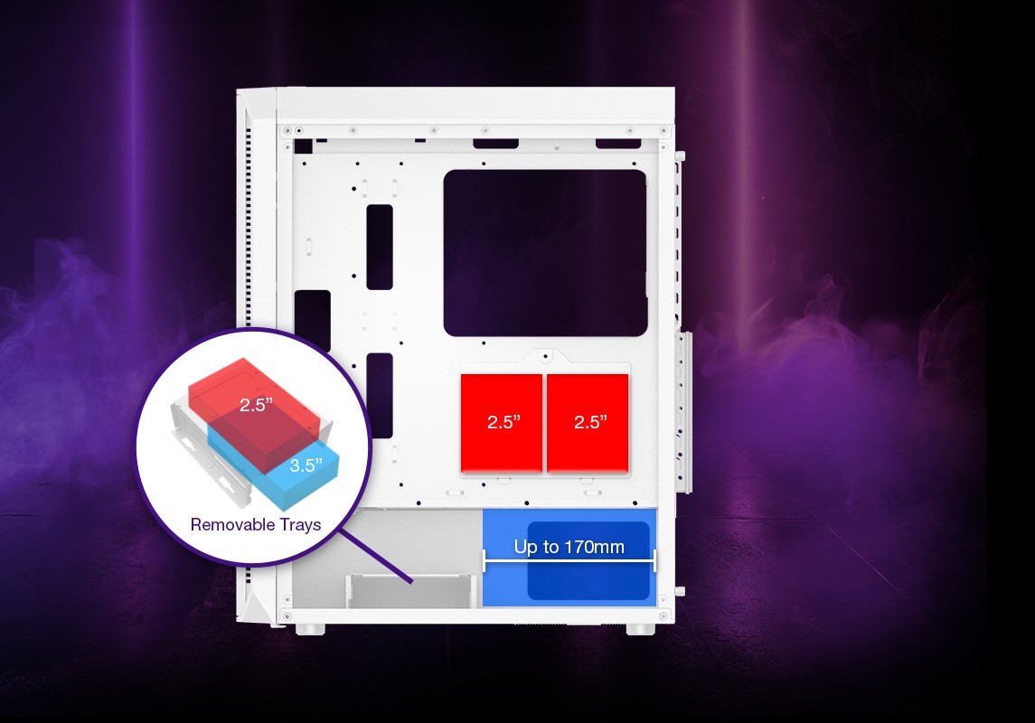 XPG VALOR AIR PLUS podporuje až 3x 2,5„ SSD nebo 2x 3,5“ HDD úložné komponenty a je vybaven odnímatelnou přihrádkou na HDD pro snadný upgrade. Navíc pojme špičkové napájecí zdroje o délce až 170 mm, jako je řada XPG CYBERCORE II.
