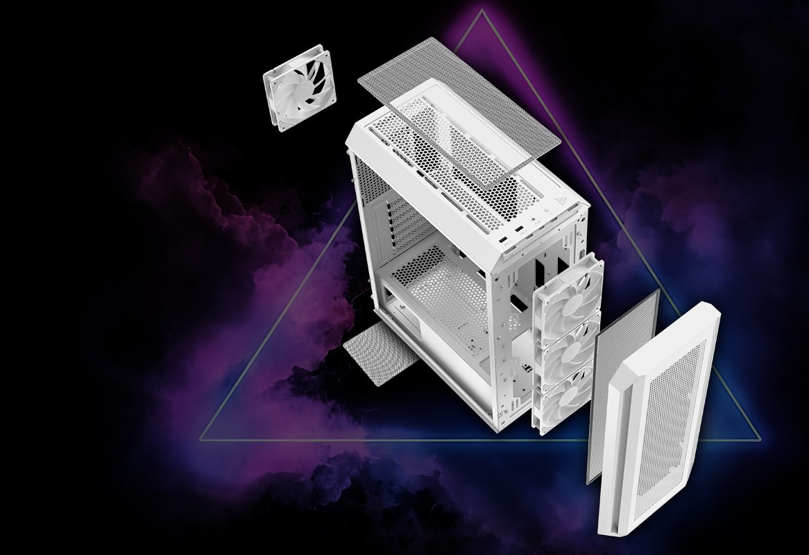XPG VALOR AIR PLUS podporuje až 6x 120mm ventilátor. Některé modely jsou dodávány se 4x předinstalovanými ventilátory ARGB, přičemž 3x jsou umístěny vpředu a 1x vzadu. Osvětlení můžete přizpůsobit pomocí podporovaného softwaru pro základní desky nebo softwaru pro správu ekosystému XPG PRIME. Snadno odnímatelný magnetický přední panel vám také umožní vyčistit přiložený prachový filtr, abyste zachovali optimální průtok vzduchu a zároveň udrželi prach mimo skříň.