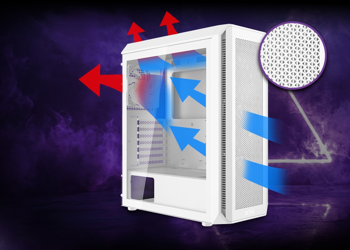 XPG VALOR AIR PLUS je vybaven magnetickým předním panelem s vysokým průtokem vzduchu, který umožňuje lepší ventilaci systému a zajišťuje efektivní přívod vzduchu pro udržení vnitřních komponent v chladu.