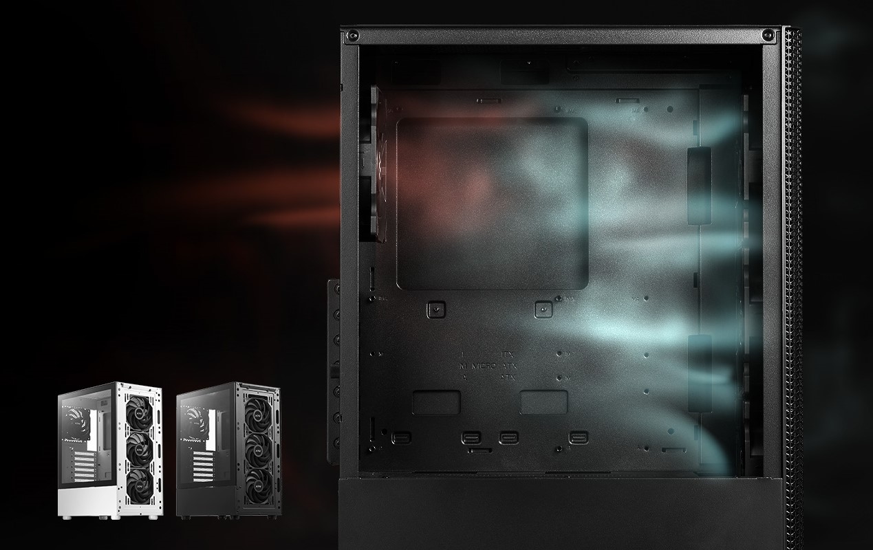 Aerodynamický design XPG VALOR MESH nabízí neuvěřitelnou podporu průtoku vzduchu: 3 předinstalované 120mm ventilátory vpředu přivádí chladný vzduch zvenku a další předinstalovaný 120mm ventilátor vzadu odvádí teplo.