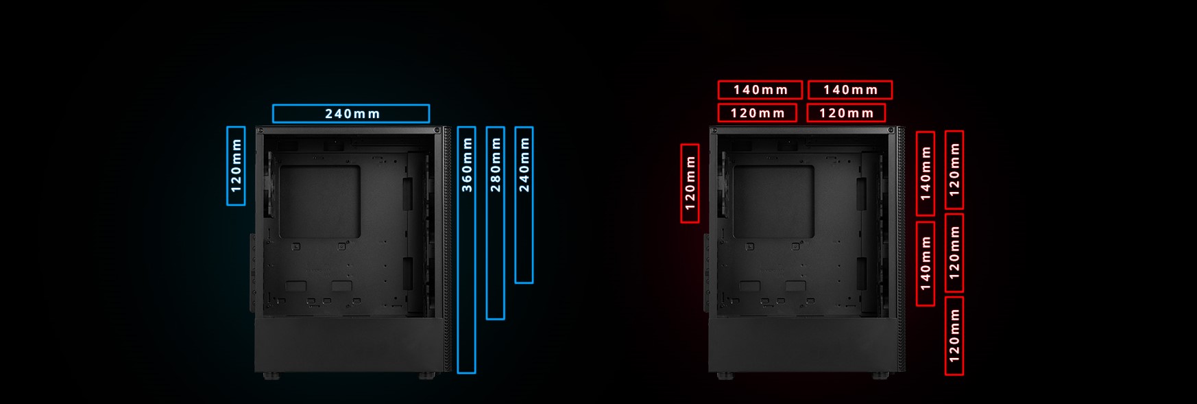 * horní: chladič 240mm; ventilátor 2x 120mm, 2x 140mm
