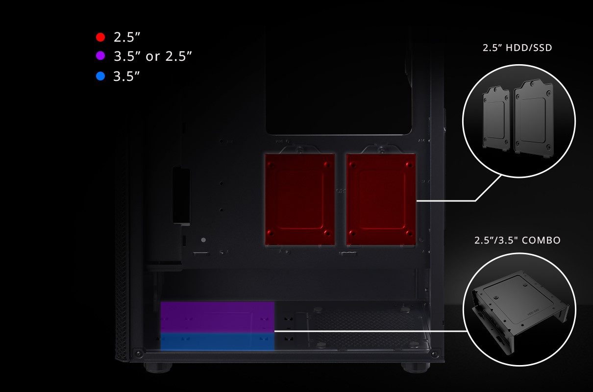 Uživatelé mohou pod kryt napájecího zdroje nainstalovat klec pro HDD, do které lze přidat dvě další úložné jednotky. Klec je dodávána jako příslušenství přímo se skříní XPG VALOR MESH. Klec podporuje buď 2 x 3,5" disky nebo 1 x 2,5" disk a 1 x 3,5" disk.