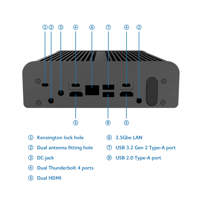 Plná podpora zadní konektivity desky NUC včetně dvou portů Thunderbolt 4 Type-C, HDMI a LAN.