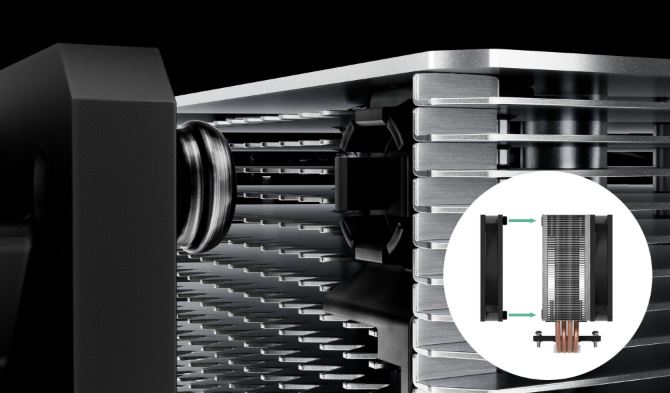 Žebra chladiče jsou po stranách otevřená a umožňují tažnému ventilátoru přitahovat další chladný vzduch z pouzdra přes chladič. Tato konstrukce s bočním prouděním dosahuje ještě účinnější ventilace.