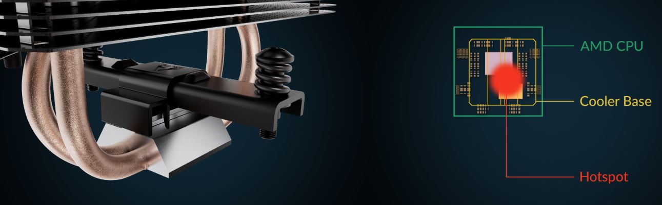 Umožňuje odsazenou montáž chladiče směrem k aktivnímu bodu CPU, což optimalizuje zarovnání asymetrických vícečipových CPU a zajišťuje efektivnější přenos tepla.