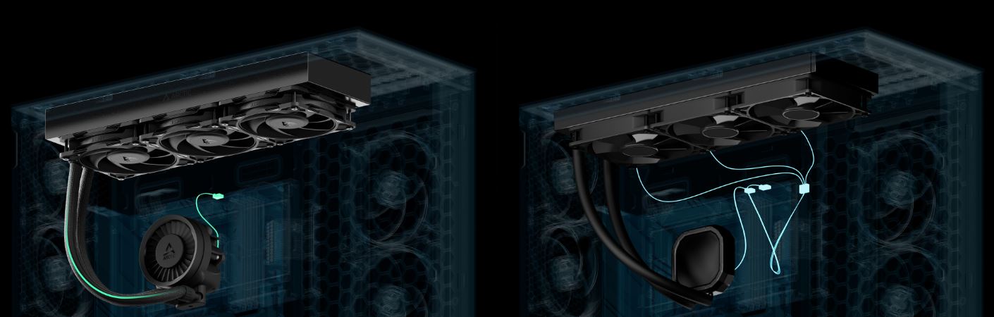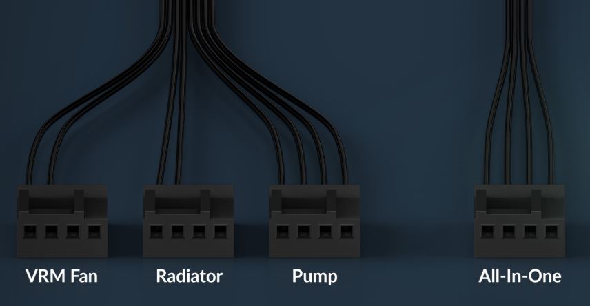 Pomocí rozbočovacího kabelu lze čerpadlo, VRM a ventilátory chladiče ovládat buď samostatně, nebo společně prostřednictvím jediného signálu PWM s kabelem vše v jednom.