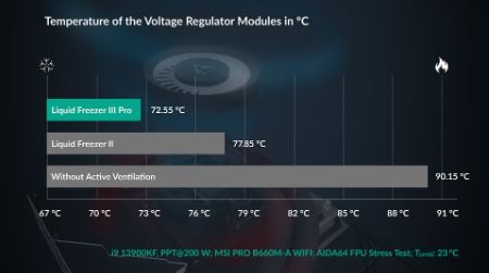 PWM-controlled fan lowers the voltage regulator temperature, ensuring stable performance.