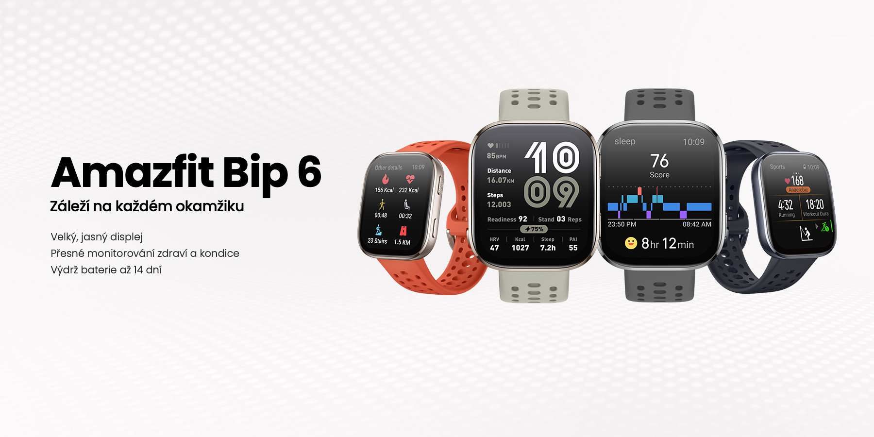 Technologie BioTracker™ vyvinutý společností Amazfit poskytuje přesné monitorování tepové frekvence, kvality spánku, saturace krve kyslíkem a stresu v reálném čase a umožňuje vám získat užitečné informace pro optimalizaci vašeho zdraví a kondice.