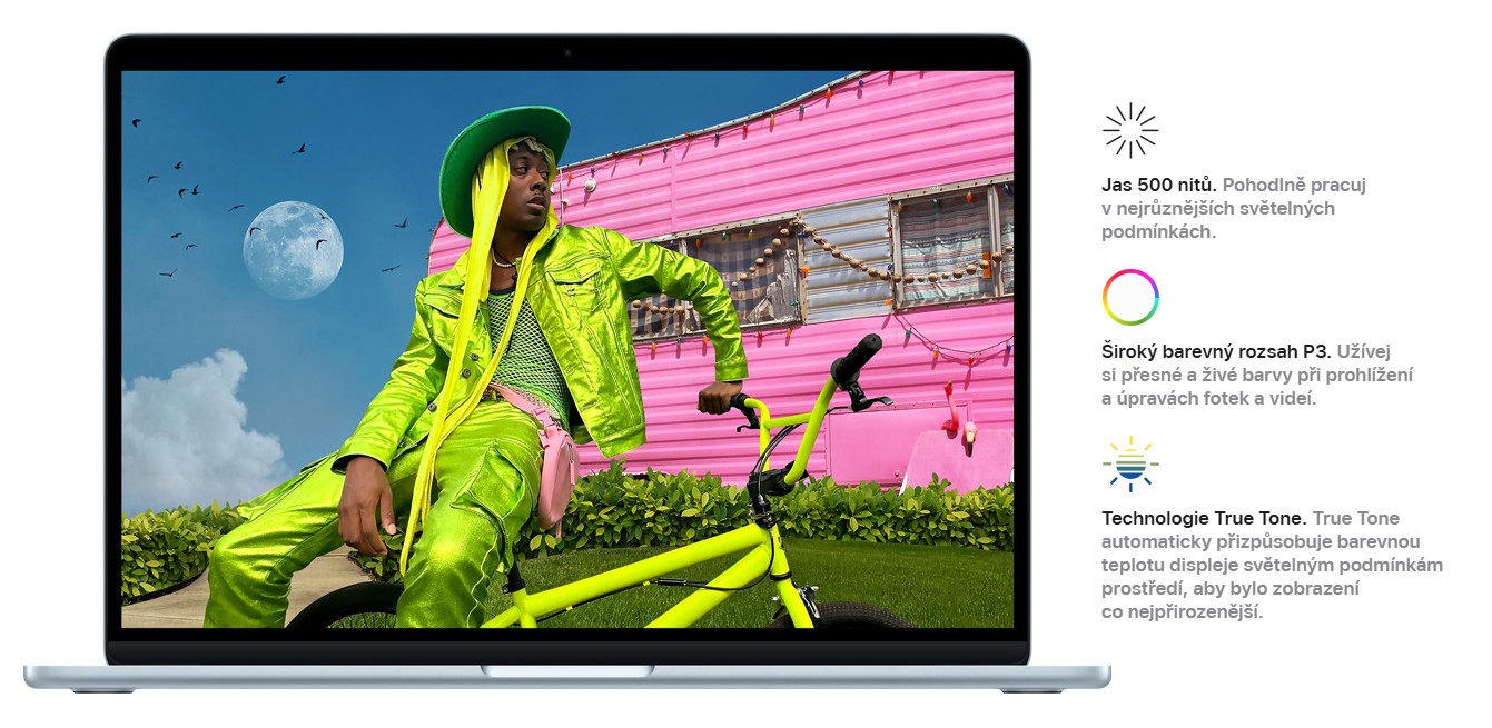 Displej: 13,6" Liquid Retina IPS, 2560×1664 při 224 pixelech na palec, LED podsvícení, 500 nitů, True Tone
