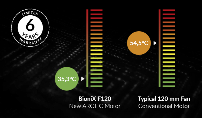O 10 °C nižší teplota motoru zdvojnásobuje životnost. Herní ventilátory BioniX mají díky nízké teplotě cívky čtyřikrát delší životnost. Proto poskytujeme záruku výrobce v délce 6 let.