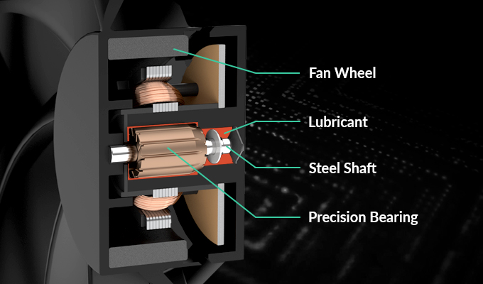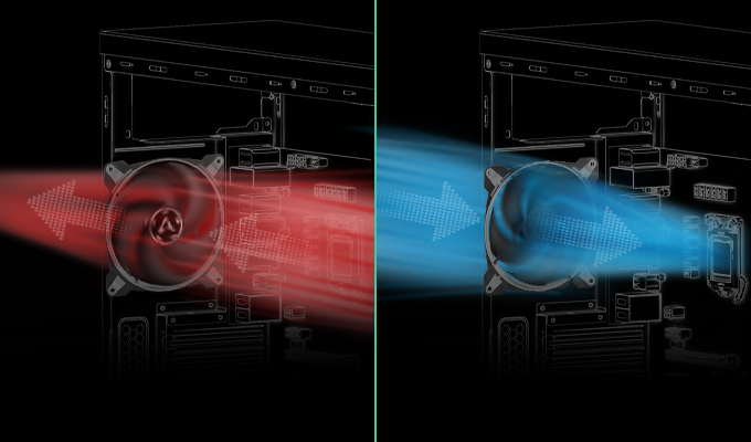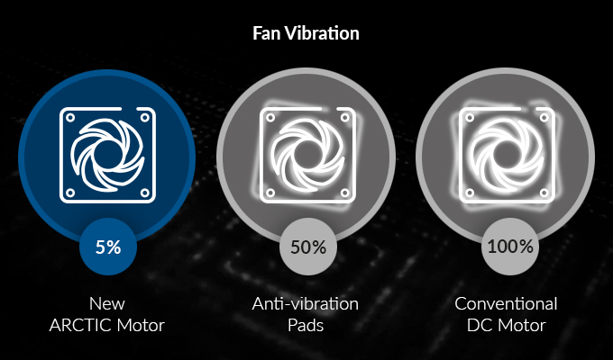 Extrémně tichý provoz díky nově vyvinutému motoru zaručuje dlouhé provozní doby bez rušivého hluku. Nový motor ventilátorů BioniX od společnosti ARCTIC eliminuje vibrace přímo u zdroje, zejména u motoru. Motor ARCTIC absorbuje 95 % vibrací ve srovnání s konvenčním stejnosměrným motorem. Díky stálému točivému momentu a plynulejšímu přepínání magnetického pole tak není třeba používat gumové distanční vložky.