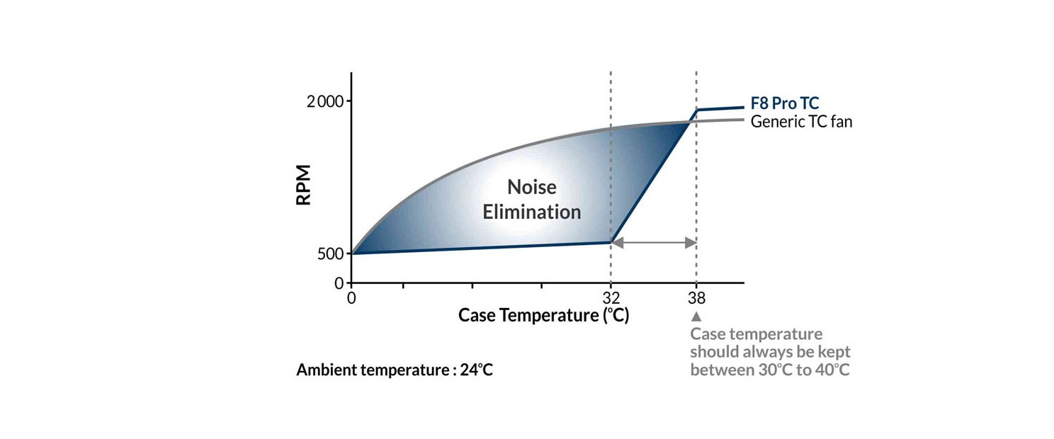 Teplotní čidlo je umístěno na 40 cm kabelu a lze jej umístit do teplých částí počítače. Tím je zajištěna teplota nejvýše 38 °C v celé skříni a podporuje se chlazení procesoru nebo grafické karty. Na druhé straně tento ventilátor udržuje hladinu hluku na absolutním minimu a zvyšuje rychlost pouze v případě nutnosti.