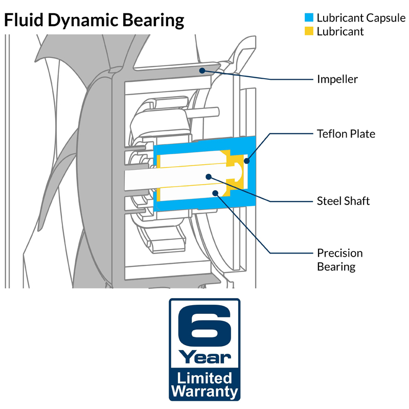 Fluidní dynamické ložisko je vybaveno olejovou kapslí, která zabraňuje úniku maziva. Toto ložisko je tedy stejně tiché jako pouzdro, ale má výrazně vyšší životnost.