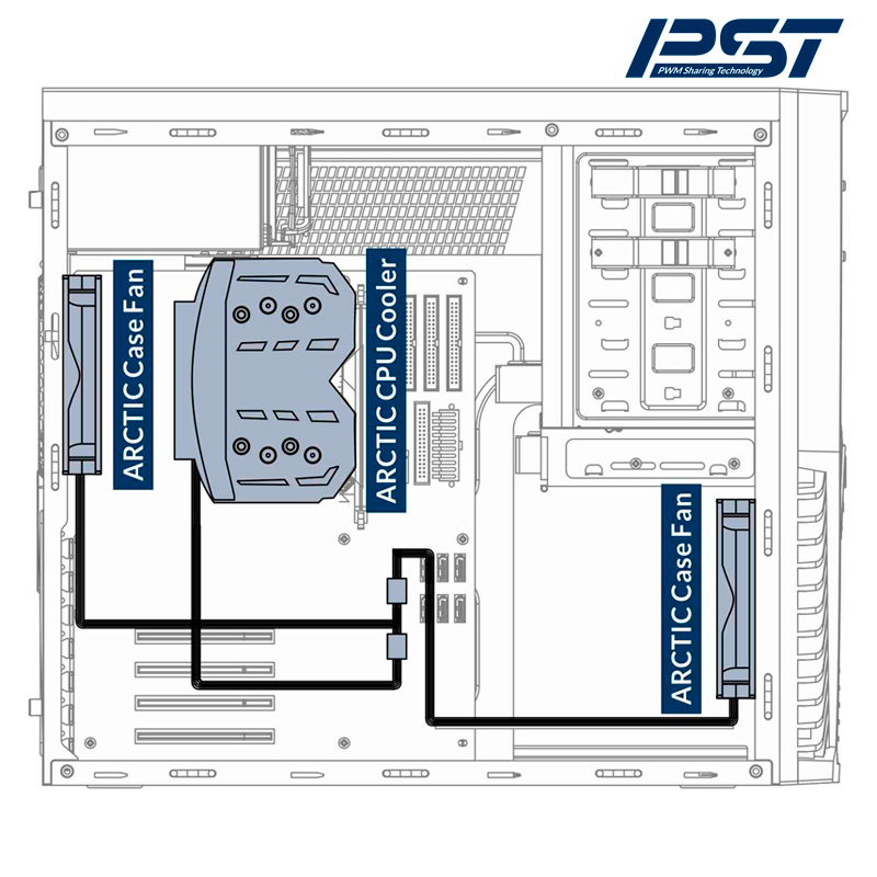 Pokud chcete zlepšit účinnost chlazení počítače, pořiďte si několik paralelně pracujících ventilátorů skříně (protože na zdvojnásobení hlučnosti je potřeba 10 ventilátorů). K čemu to ale pomůže, když nebudou spolupracovat? PST zajišťuje, že všechny vaše ventilátory poslouchají jeden řídicí signál. Např. sdílíte PWM signál chladiče procesoru a zajistíte, aby se ventilátory skříně při nízkém zatížení zastavily a roztočily se, kdykoli je to nutné.