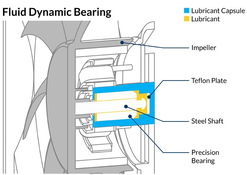 Fluidní dynamické ložisko je vybaveno olejovou kapslí, která zabraňuje úniku maziva. Toto ložisko je tedy stejně tiché jako pouzdro, ale má výrazně vyšší životnost.
