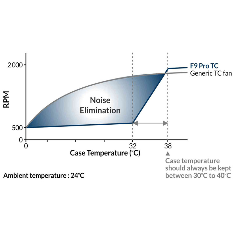 Snímač teploty je na 40 cm kabelu a lze jej umístit do teplých míst počítače. Tím je zajištěno, že teplota nikde ve skříni nepřesáhne 38 °C, a je podpořeno chlazení procesoru nebo grafické karty. Na druhou stranu tento ventilátor udržuje naprosto minimální hlučnost a zvyšuje otáčky pouze v případě potřeby.