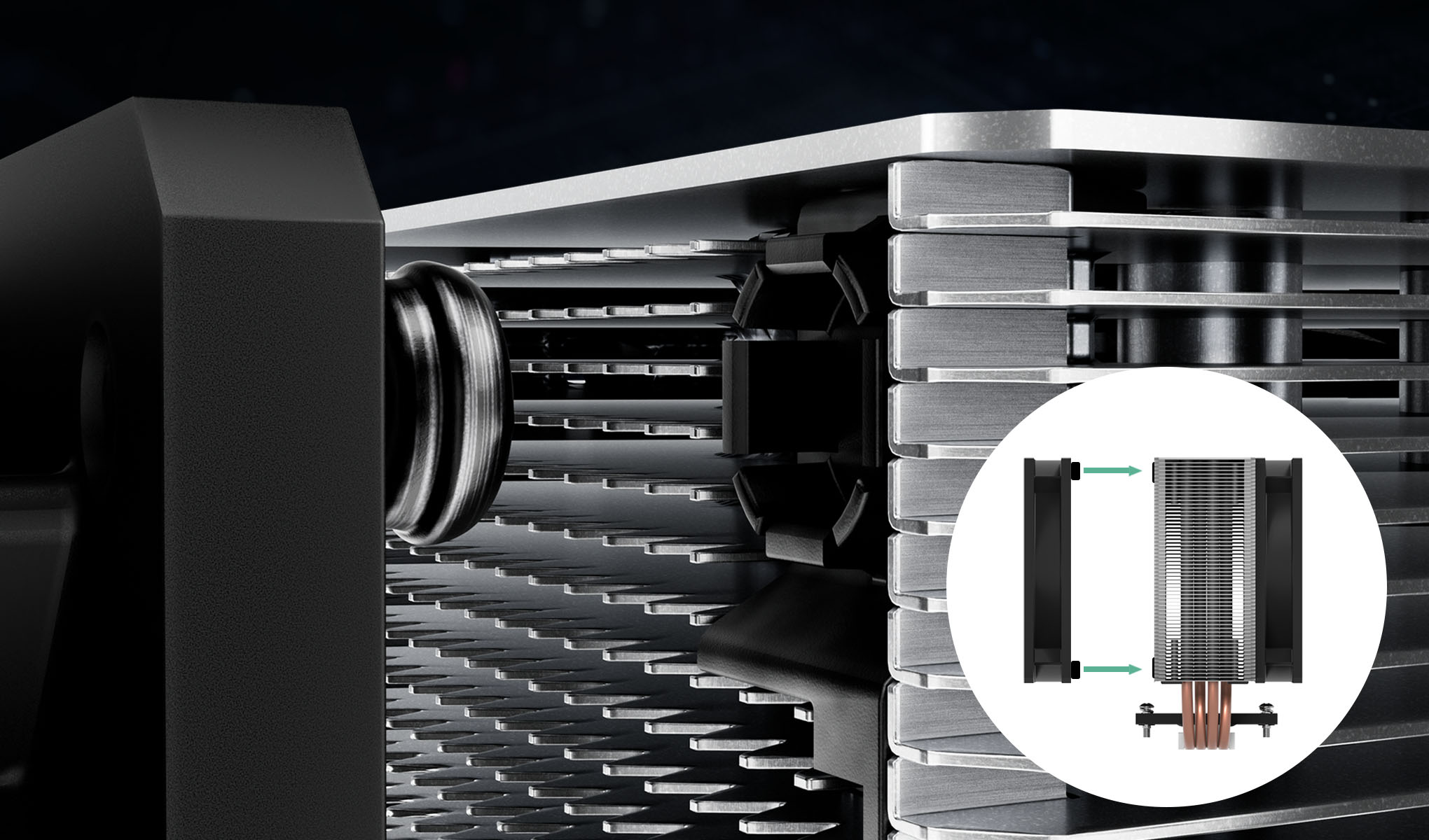 Ĺ˝ebra chladiÄŤe jsou z boku otevĹ™ená a umoĹľĹujĂ ventilátoru nasávat dalšà chladnĂ˝ vzduch z poÄŤĂtaÄŤovĂ© skĹ™ĂnÄ› pĹ™es chladiÄŤ. Tato konstrukce s boÄŤnĂm proudÄ›nĂm dosahuje ještÄ› účinnÄ›jšĂho vÄ›tránĂ.